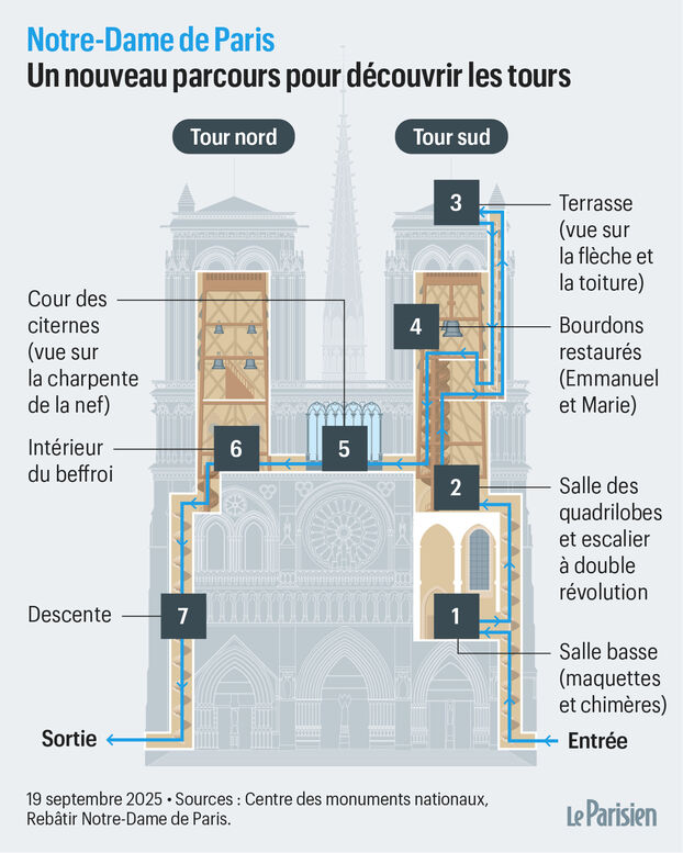 Il est rouvert depuis le 20 septembreouiEn 2025, les clochers rénovés seront accessibles depuis l’extérieur de Notre Dame (entrée à droite de la tour sud, sortie à gauche de la tour nord).